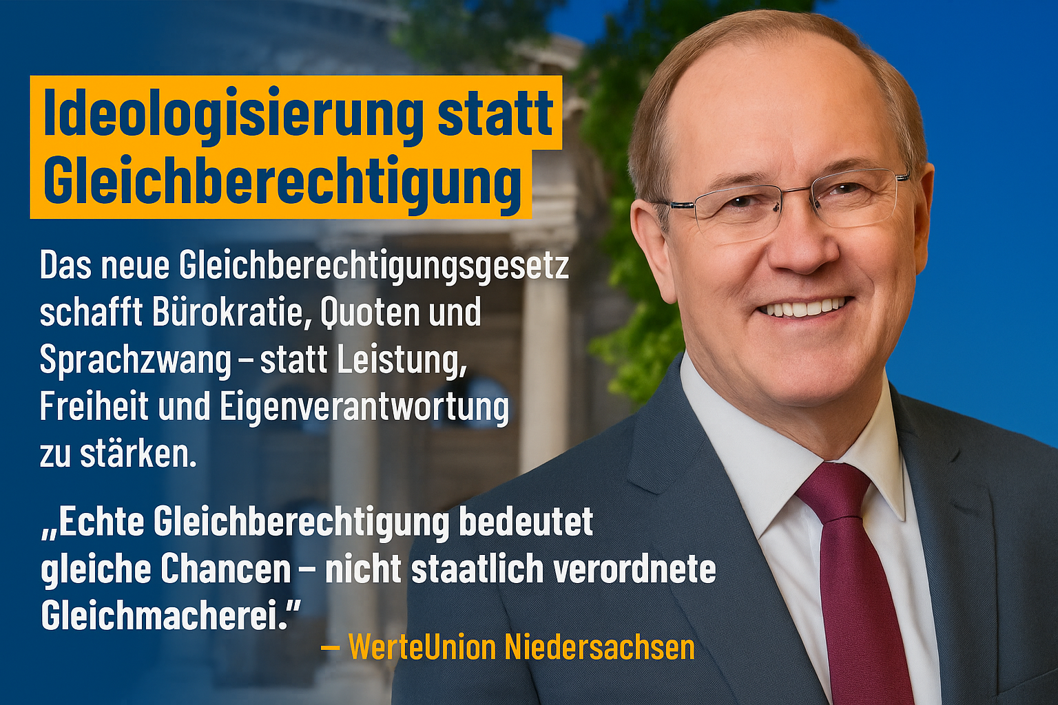 Pressemitteilung Parallelverwaltung für Ideologen: Neues Gleichstellungsgesetz schafft teure Posten Hannover, 29. Oktober 2025 –Die WerteUnion Niedersachsen warnt vor dem Gesetzentwurf der Landesregierung zur „Gleichberechtigung von