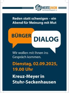 Unter dem Motto „Reden statt schweigen – ein Abend für Meinung mit Mut“ hat die WerteUnion im Kreis Diepholz am 2. September 2025 zu einem offenen Bürgerdialog eingeladen. Veranstaltungsort war das traditionsreiche Hotel Kreuz-Meyer in Stuhr-Seckenhausen.