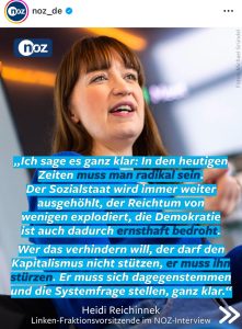 Ein besonders zugespitztes Beispiel hierfür bietet die öffentliche Äußerung einer linken Abgeordneten, die in einem Interview den „Sturz des Kapitalismus“ forderte und damit ausdrücklich „die Systemfrage“ stellte. Solche Aussagen verweisen auf eine radikale Systemkritik, die sich nicht nur gegen ökonomische Strukturen richtet, sondern auch auf eine grundlegende Neuordnung der Gesellschaft zielt – und damit in einem Spannungsverhältnis zu den Prinzipien der freiheitlich-demokratischen Grundordnung steht.